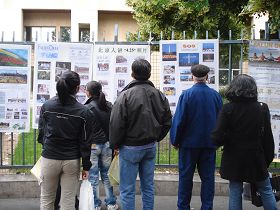 Le panneau informant à propos du Falun Gong a attiré l'attention de nombreux passants chinois |
