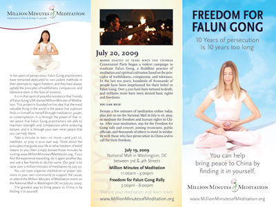 Friends of Falun Gong / Les amis du Falun Gong a annoncé un nouveau projet pour éveiller la conscience au sujet de la persécution du Falun Gong, en offrant aux gens une occasion de faire quelque chose d’unique pour aider à arrêter la persécution et d’aligner leurs cœurs avec Dafa d'une façon très positive. Le projet s'appelle Un million de minutes de méditation, et ce sera une partie importante des activités à Washington, D.C, pour commémorer le dixième anniversaire de la persécution.