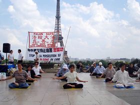L’après midi du 28 juin 2009, on a pu voir encore une fois les pratiquants de Falun Gong sur la Place des droits de l'homme sur fond de Tour Eiffel. Certains pratiquant les exercices, d'autres discutant avec les gens et leur révélant la persécution ayant cours en Chine. Une scène paisible devenue pour certains familières et suscitant depuis dix ans l'intérêt et la curiosité de touristes du monde entier.