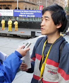 M. Fan Ping vient de Pékin : « Je respecte ce que font les pratiquants de Falun Gong. » Il a dit : « J’ai quelques amis qui pratiquent le Falun Gong et je sais que ce sont toutes des personnes de bien. J’ai aussi voulu apprendre les exercices mais j’étais trop occupé avec mon travail. Je n’aime pas ce que fait le Parti communiste chinois et je vous soutiens. Il y a quelques temps quand je visitais Canberra, j’ai vu des pratiquants de Falun Gong manifester devant l’Ambassade de Chine et distribuer des dépliants aux passants. Je les ai rejoints pour tenir la banderole et par la suite je les ai aidés à distribuer les dépliants. Voilà ce que je peux faire [pour aider]. »