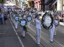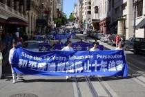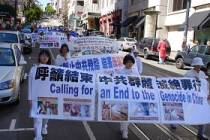 À 15h00, les pratiquants et les sympathisants du Falun Gong ont commencé une marche. Le défilé a marché du Golden Garden dans le Chinatown à Union Square en passant par la rue Stockton. Conduit par des banderoles géantes sur lesquelles on pouvait lire « Appel pacifique pour les consciences – Arrêter la persécution du Falun Gong », « Falun Dafa est bon » et « Le monde a besoin de Vérité – Compassion – Tolérance » des dizaines de pratiquantes vêtues de blanc tenaient des portraits de pratiquants chinois qui ont été torturés à mort en Chine. Des douzaines de pratiquants affichaient des banderoles et des affiches où on pouvait lire « Arrêter la persécution du Falun Gong », « Désintégrer le PCC – Arrêter la persécution » « Appuyer les 57 millions de Chinois qu ont renoncé au PCC pervers », « Le Ciel élimine le PCC – Le Ciel protège la Chine. » Quelques pratiquants ont distribué des dépliants de clarification de la vérité le long du parcours. De nombreuses personnes se sont arrêtés pour regarder le défilé et prendre des photos.