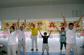 Les pratiquants ont dressé des banderoles sur lesquelles on pouvait lire « Falun Dafa » et « Authenticité – Compassion – Tolérance » et étalé des documents imprimés pour présenter le Falun Dafa. Ils ont distribué un grand nombre de dépliants et de nombreuses personnes se sont renseignées sur le Falun Gong et la vérité derrière la persécution du Falun Gong en Chine.
