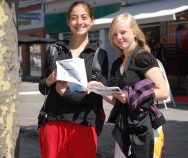 Ayant entendu la présentation du Falun Gong, deux filles ont demandé "Pouvons nous distribuer vos imprimés . " Après qu'on leur ait dit Ok, elles ont joyeusement pris une pile d'imprimés à distribuer dans les boutiques voisines, puis sont revenues pour en prendre un autre paquet.
