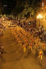Les groupes de tambourins à ceinture et des tambours Tang avec leurs costumes jaune or ont marché dans les rues sur la musique de « Falun Dafa est bon » et « Célébrations. » Le défilé ordonné et le roulement rythmé des tambours a ému les spectateurs le long des rues. Les gens ont salué avec des jouets clignotants dans leurs mains ou ont applaudi au son des tambours. Quand ils ont fini une chanson, les spectateurs ont scandé « encore ».