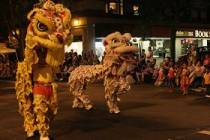 Deux lions ont dansé avec le groupe des tambours le long du parcours, et les spectateurs ont beaucoup aimé la danse du lion.
