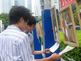Mademoiselle Zhang de Los Angeles est une pratiquante du Falun Gong. Son ami M. Jiang, qui n’avait jamais pratiqué le Falun Gong jusque là , est venu spécialement pour participer aux activités. Il a dit qu’il espérait que les touristes de Chine continentale pourraient ramener chez eux les faits concernant la persécution. Après avoir vu les bénéfices que son amie avait retiré de la pratique du Falun Gong dès ses débuts , M. Jiang a compris que Falun Gong était véritablement une grande voie d’élévation personnelle. Mademoiselle Zhang a montré les photos des pratiquants qui ont été tués en Chine et a dit qu’elle était reconnaissante à ceux qui avaient persisté dans leur foi. Si cela n’avait pas été leurs efforts, elle n’aurait peut-être pas eu la chance d'entendre parler du Falun Gong.