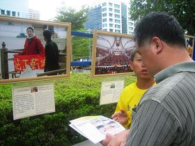 M. Wu est venu spécialement de Hsin-chuang pour apprendre les faits concernant le Falun Gong après avoir lu qu’il y avait cette manifestation, dans un article de The Epoch Times . Il a lu les pancartes et a écouté les pratiquants parler de la persécution. Il a dit avec regret qu’il avait auparavant entendu de faux reportages concernant le Falun Gong, et avait eu des incompréhensions sur la pratique. Il a été heureux d’avoir pu apprendre les faits et que le voyage qu’il avait entrepris en valait bien la peine.