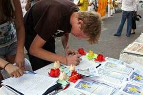 Un passant signe son nom en soutien au Falun Gong après avoir appris la persécution
