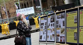 Les pratiquants demandent aux gens de reconnaître la nature perverse du PCC et de voir les désastres qu’il a apportés à la Chine. Madame Tian, qui est venue en Australie en provenance de la Chine, il y a un an, a exprimé son respect aux pratiquants du Falun Gong. Elle a dit : «Ma mère a été torturée par le PCC, ma famille a beaucoup souffert pendant la Révolution culturelle. Le PCC est néfaste pour la Chine mais les efforts des pratiquants du Falun Gong sont bénéfiques pour la société. J’espère que plus de personnes se joindront à vous.»
