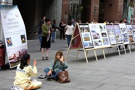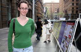 Dans le Parc Belmore, les pratiquants ont mis en place des panneaux d’affiches de clarification de la vérité, qui avaient plus de 200 pieds de long, pour dénoncer la persécution brutale du Falun Gong. Une étudiante chinoise a dit qu’elle n’avait aucune idée comment la persécution était, et elle a été troublée lorsqu’elle a vu les photos. Elle a immédiatement renoncé au Parti.