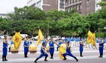 La fanfare de la Terre divine et le groupe des drapeaux s’exécute lors de la cérémonie d’ouverture.
