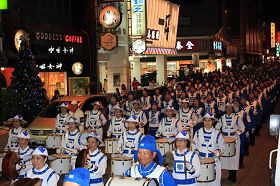 Quarante-six groupes ont pris part au défilé et plus de dix milles personnes l’ont regardé. La fanfare de la Terre divine, composée de plus de 100 pratiquants de Falun Gong, a joué pendant le défilé. À la suite de la fanfare, il y avait les pratiquants du groupe de danse traditionnelle chinoise. Les pratiquants ont également distribué des fleurs de lotus en papier faites main et des marque-pages du Falun Dafa.
