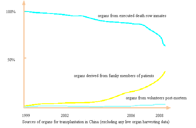 Selon les rapports officiels, de 2000 à 2008, le pourcentage des organes donnés à des fins de greffes par les membres de famille des patients a augmenté chaque année. Dans le même temps, le pourcentage des organes imputés aux détenus condamnés à mort décroissait. Le nombre provenant de donneurs post-mortem sans liens de parenté, reste insignifiant tout du long. En 1999, les donneurs familiaux comptent pour 2% des greffes d’organes totales. En 2004, le nombre était de 4%. [4] En 2006, il s’est élevé à 6%. Selon des sources officielles citées par le China Daily, en 2008 et 2009, les donneurs ayant des liens de parenté comptaient pour 40% de toutes les greffes d’organes, et prés de 60% venaient de détenus condamnés à mort, alors que les organes pris sur des donneurs post-mortem comptaient pour seulement 130 cas. [5] Le magazine Caijing de Chine (N° 24, 2005) rapportait que 95% des organes provenaient de cadavres, presque tous étant de détenus condamnés à mort.’’ [6] Le magazine Life Week rapportait en 2006 : ‘’Le contrôle de 98% des sources d’organes pour les greffes en Chine, réside hors du système du ministère de la santé.’’ [7] Le site Internet des enregistrements des greffes de foies de Chine, a listé des statistiques incomplètes sur les greffes de foie de 1999 à 2006. Bien que le nombre total recensé soit bien en deçà du nombre réel de greffes effectuées dans toute la Chine, il est utile en montrant le pourcentage d’organes vivants parmi tous les organes greffés, ce qui confirme que les organes à vif comptent pour un très petit pourcentage avant 2006. [8]