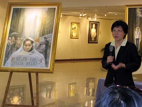 Lin Liyun, directeur du centre d'étude de journalisme à l'Université de Taïwan (milieu), a été profondément touchée par la puissance édifiante dans les peintures