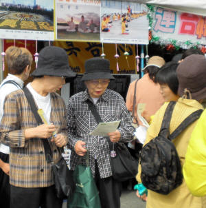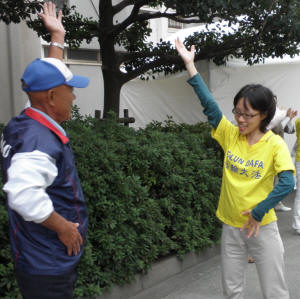 Quand un résident local a appris au sujet de la persécution en cours, il a dit immédiatement qu'il voulait apprendre les exercices tout de suite. Un touriste chinois a posé de nombreuses questions sur la persécution. Après que les pratiquants aient répondu à ses questions, il a dit qu'il en trouverait plus sur le site internet après son retour et il a demandé où il pouvait apprendre les exercices à Amagasaki.