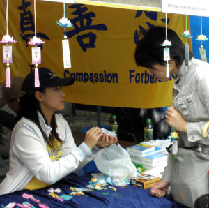 À la table du Falun Dafa, beaucoup ont été intéressés par les fleurs de lotus en papier faits par les pratiquants. Quelques passants en ont demandé et d'autres ont demandé la façon de les plier. Tout en satisfaisant les demandes des passants, les pratiquants leur ont distribué des dépliants du Falun Dafa, leur ont parlé de la beauté du Falun Dafa et ont souligné le site internet imprimé sur les marque-pages, sous les fleurs de lotus en papier