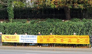Le 23 octobre, les pratiquants du Falun Gong étaient rassemblés devant le Consulat chinois tenant des longues banderoles de cent mètres de long, sur lesquelles on pouvait lire : «Falun Dafa est bon », «Le monde a besoin d ‘ Authenticité – Compassion – Tolérance », « Dissoudre le Parti communiste chinois » et ainsi de suite.