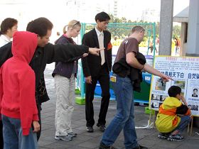 Vers 9h 00 à la Place de la Liberté, les pratiquants ont commencé à mettre en place des banderoles et des affiches de clarification de la vérité et distribuer des documents aux touristes. À un coin de la Place, les pratiquants ont érigé une tente d'information du Falun Gong, qui a attiré de nombreux touristes chinois du continent. À l'entrée principale de la Place, une banderole géante « Chine, Arrêtez la persécution du Falun Gong » a été affichée. Quelques chinois du continent ont pris des photos de la banderole et quelques-uns étaient heureux de dire aux pratiquants qu'ils avaient déjà renoncé au Parti communiste chinois et à ses organisations affiliées.