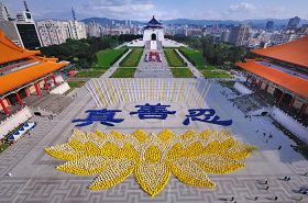 Selon Chunmei Huang, vice-président de l'Association du Falun Dafa de Taïwan, les pratiquants de Taiwan ont formé les caractères chaque année pendant la Conférence de partage d'expérience et pour la Journée mondiale du Falun Dafa. « L'année dernière, nous avons formé un prototype du livre Zhuan Falun et avons reçu des commentaires très positifs. Cette année, avec plus de 5,000 pratiquants, nous avons formé un coussin en fleur de lotus géante supportant les trois caractèrs chinois; Authenticité – Compassion et Tolérance. La fleur de lotus représente la pureté et le royaume supérieur des pratiquants et Authenticité, Compassion et Tolérance sont les principes directeurs du Falun Dafa. »