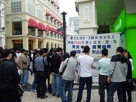 Situé au centre de la ville, le Carré du sénat est aussi un centre d'affaire, de finance et de politique à Macau. Tous les touristes visitent le Carré du sénat. C'est souvent visité par d'énormes foules de touristes durant les congés. Les pratiquants tiennent des activités au Carré du sénat le samedi, dimanche et les après-midis de congés. Ils répandent les nouvelles de Falun Dafa, partagent leur expérience personnelle, dénoncent la persécution du Falun Gong par le PCC et aident les gens à quitter le PCC.