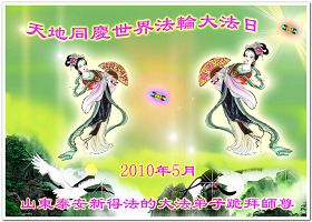 Un pratiquant qui vient d'obtenir la Loi à Tai'an, célèbre la journée mondiale du Falun Dafa et souhaite respectueusement au vénérable Maître un joyeux anniversaire !