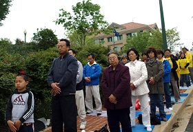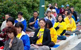Des banderoles disant « Falun Dafa est bon » « Le monde a besoin d’Authenticité-Bienveillance-Tolérance » et « Traduisez Jiang Zemin en justice » étaient suspendues sur la clôture vis-à-vis de l'ambassade chinoise. Plus de cent pratiquants ont paisiblement fait la démonstration des exercices. Le groupe était composé de personnes de différentes nationalités, professions et de tous les âges. Certains d'entre eux avaient participé à l'appel du 25 avril en 1999 et d’autres ont commencé la pratique il y a peu de temps. Ils ont partagé leurs expériences de cultivation.