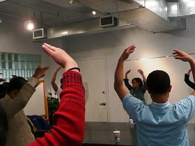 Dans la soirée du 1er mai, 2010, la diffusion de la [première] vidéo de la série des Neuf Jours de Conférence du Falun Dafa a commencé à la Librairie Tianti, à Manhattan. Plus d’une douzaine de pratiquants occidentaux et chinois ont regardé attentivement la vidéo de Maître Li enseignant la Loi dans la ville de Guangzhou, en Chine. Ils seront de retour chaque soir pour un total de neuf jours. Après la vidéo, ils apprennent et pratiquent les exercices du Falun Gong.