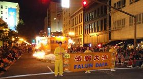 C’était le 105e Défilé Starlight à Portland. Le défilé a commencé peu après le crépuscule. Les pratiquants ont présenté les exercices sur le char, qui avait 40 pieds de long, 12 pieds de large et 24 pieds de hauteur. Il a été conçu par quatre ingénieurs qui pratiquent le Falun Gong et a pris aux pratiquants environ 1000 heures/homme pour le terminer.