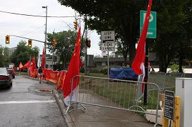 Le groupe de bienvenue qui était tous habillés pareils et criait les mêmes slogans, n’était pas satisfait de la dimension de leur site de rassemblement. Il essayait continuellement de bloquer les banderoles du Falun Gong. La police a par la suite séparé les deux groupes.