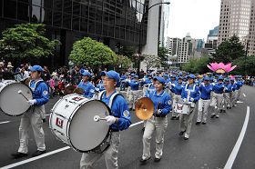 En soirée, le 1er juillet, un défilé a été organisé au centre ville de Vancouver pour célébrer la 143ième célébration de la Fête nationale. La Fanfare de la Terre divine et la troupe des tambourins de ceinture des pratiquants de Falun Gong ont participé au défilé et leur performance a reçu des applaudissements enthousiastes de la part des spectateurs.