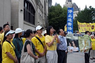 Plus tôt, dans la matinée, Mme Shi, une pratiquante d’Ottawa, est arrivée à l’Hôtel Westin où logeait Hu. Elle a trouvé un nombre d’étudiants chinois qui avaient mis en place des dizaines de drapeaux chinois devant les banderoles du Falun Gong, pour les cacher. Elle leur a parlé du Falun Gong et de la persécution et leur a expliqué pourquoi le PCC craignait la protestation du Falun Gong. Lentement, les étudiants ont modifié leur attitude. Ils y avait une rotation de personnes pour surveiller leurs drapeaux, toutes les dix minutes. Mme Shi leur a parlé un à un et les a aidés à renoncer au PCC et à ses organisations affiliées. Un étudiant a dit à Mme Shi, après avoir renoncé au PCC : « Je vais mettre le drapeau un peu plus bas ainsi il ne masquera pas votre banderole. » Il a ajouté : « Votre banderole est de qualité professionnelle et très robuste. Les drapeaux rouges sont tenus avec des ficelles et les signes ne sont pas droits. »