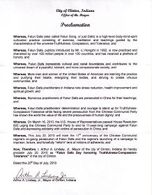 Le 20 juillet 2010, Arthur A. Lindsay, maire de la ville de Clinton en Indiana, a proclamé le 20 juillet 2010 comme étant « La journée du Falun Dafa honorant Authenticité – Compassion – Tolérance » dans le ville de Clinton.