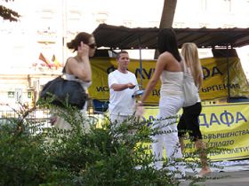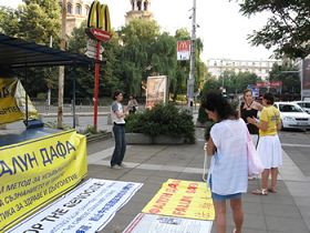 Pour commémorer le onzième anniversaire d'opposition à la persécution du Falun Gong, les pratiquants bulgares ont organisé une journée d'information le 20 juillet 2010, pour présenter la pratique du Falun Gong et dénoncer la persécution par le Parti communiste chinois à Sofia, la capitale, et dans deux autres villes, Plovdiv et Varna. Ce jour-là, nous avons rencontré un jeune homme qui a dit qu'il avait rencontré des pratiquants en Irlande et qu'il savait la vérité sur ce qui se passait. Aussi, deux Grecs qui avaient reçu des dépliants ont dit qu'ils se souvenaient d'avoir rencontré des pratiquants qui avaient tenu des activités similaires ici avant. Après que plusieurs jeunes dames de l'endroit aient découvert qu'il s’agissait d'une activité liée au Falun Gong, elles ont immédiatement signé leur nom. Elles ont dit qu'elles avaient déjà entendu parler du prélèvement brutal des organes des pratiquants encore vivants dans un but lucratif.
