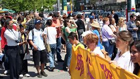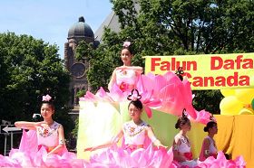 Le 27 mai 2006, plus de 2,000 pratiquants du Falun Gong de partout dans le monde se sont rassemblés au Dundas Square dans le Centre-ville de Toronto pour participer à un rassemblement et à un grand défilé pour célébrer le 14e anniversaire de la présentation du Falun Dafa au public. En plus de louer la grâce du Falun Dafa, les pratiquants ont demandé aux gens de les aider à mettre fin à la persécution du Falun Gong par le Parti communiste chinois (PCC).