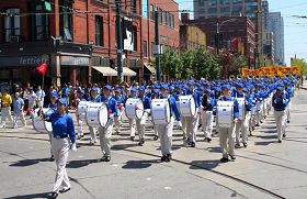 Dans l'après-midi du 19 mai 2002, environ 1,500 pratiquants de 15 pays ont organisé un grand défilé pour célébrer le dixième anniversaire de la présentation du Falun Dafa au public. Le défilé a progressé le long de University Avenue et il est passé par le Chinatown de Toronto.