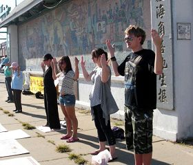 Un groupe de jeunes s'est tenu en rangée pour apprendre les exercices du Falun Gong. L'un d'entre eux a senti une forte énergie et on lui a donné des informations détaillées sur le Falun Gong et la persécution.