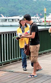 Mme Yeh a clarifié les faits sur la persécution du Falun Gong à des touristes en provenance de la Chine dans la dernière année. Elle est arrivée au Lac Soleil Lune à neuf heures du matin. Après avoir fait ses exercices, elle a commencé à distribuer des dépliants aux touristes, leur a parlé de la persécution illégale du Falun Gong en Chine, et leur a parlé de la tendance actuelle de renoncer aux organisations du PCC. Elle ne voulait pas rater tous ceux qui passaient là et parfois elle n'avait pas le temps de manger ou de boire de toute la journée.