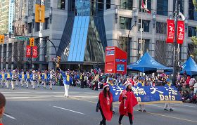 C'était une belle journée. Le cortège du groupe du Falun Gong se composait de la Fanfare Terre divine, d'un groupe de danse de « Fées célestes » d'un gros char, et d'une troupe de tambourins à ceinture et d'une équipe de banderole.