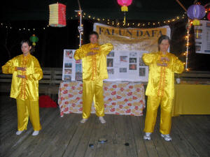 Beaucoup de lanternes aux vives couleurs étaient suspendues autour du pavillon avec des ornements qui pendaient sur lesquels on lisait « Falun Dafa est bon ». Une table avait été mise en place pour faire des fleurs de lotus en papier et l'enseigner à qui était intéressé à apprendre comment les fabriquer. Une autre table avait de la documentation sur les Neuf commentaires sur le Parti communiste et des dépliants sur le prélèvement des organes sur les pratiquants encore vivants par le Parti communiste chinois (PCC). Il y avait également deux copies du livre Zhuan Falun et deux panneaus d'affiches avec des photos: l'un avec des photos des exercices en groupe et l'autre avec des photos de la persécution du Falun Gong par le Parti communiste en Chine.
