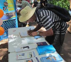 Un homme signe la pétition qui condamne la persécution du Falun Gong.