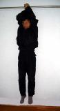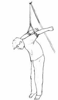 Attacher avec des cordes : les cordes sont attachées sur les bras proches près des épaules derrière le dos, puis la personne est suspendue avec la corde jusqu'à la limite où