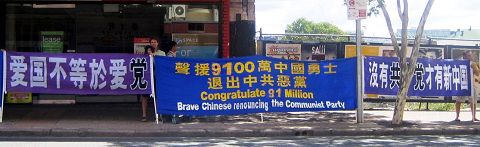 Des banderoles déployées dans le Chinatown de Brisbane pendant le rassemblement en soutien aux 91 millions de personnes qui ont renoncé au Parti communiste chinois. |