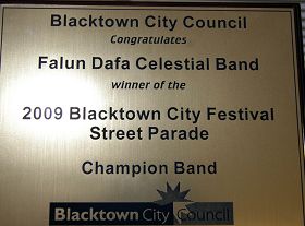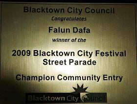 Une cérémonie a été organisée par la ville de Blacktown pour honorer les lauréats de l'édition 2009 du Festival du défilé de rues de la ville de Blacktown, le 17 juin 2009. Le Falun Dafa et sa fanfare Terre divine ont reçu deux prix : Champion de la participation communautaire et Champion de fanfare et pour un total de mille dollars. Le gouvernement local a annoncé que le Falun Dafa conduirait le défilé l'année prochaine,