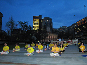 Comme le crépuscule tombait sur ce 25 avril, les pratiquants de Falun Gong, depuis le Delaware jusqu’au sud du New Jersey, se sont rassemblés au parc historique national de l’indépendance à Philadelphie, le parc où se trouve la Liberty Bell (cloche de la liberté) et l’Independence Hall (hall de l’indépendance), où la constitution américaine a été signée.