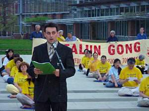 La commémoration était organisée par Alex Luchanski, un résident de Pennsylvanie qui pratique le Falun Gong depuis 2005. M. Luchanski a dit : « Alors que le premier ministre de l’époque, Zhu Rongji, avait rencontré les pratiquants et avait été d’accord pour honorer leurs demandes, l’oppression officielle s’est accentuée peu de temps après l’événement. L’appel des pratiquants de Falun Gong a été interprété comme une attaque contre le gouvernement… » En réalité, seulement une petite fraction des pratiquants de Falun Gong près de Pékin sont allés au bureau d’appel.