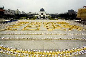 Cinq mille pratiquants forment une fleur de lotus et les caractères chinois « Authenticité-Bienveillance-Tolérance » devant le Mémorial national de Chiang Kai-shek le 27 novembre 2010.