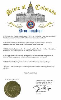 Le 22 avril 2011, John Hickenlooper, gouverneur de l'état du Colorado a proclaimé le 13 ami 2011, comme la Journée du Falun Dafa dans l'état du Colorado.