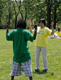 Mme Kang était très heureuse de se joindre à la célébration. Elle a dit : « Je suis arrivée l'année dernière en Amérique. L'impression la plus profonde de ce pays est que c'est une terre libre. Il est impossible d'avoir un événement comme ceci en Chine. Je suis si excitée ! Il y a 12 ans que le Parti communiste chinois a lancé sa persécution contre le Falun Gong en 1999. Il n'y a aucun environnement pacifique pour que nous puissions pratiquer en Chine. Je suis très contente de pouvoir faire les exercices et célébrer la journée de Falun Dafa avec les pratiquants à St Louis. Je n’ai pas de mots pour décrire mon appréciation du Falun Gong. Maître Li Hongzhi m’a apporté un renouveau dans ma vie. Je souhaite au Maître, un Joyeux anniversaire ! »