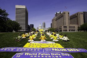 Le 7 mai, les pratiquants de Falun Gong de St Louis, Missouri ont organisé des activités à la voûte de St Louis, une attraction touristique célèbre connue sous le nom de « Passage à l'ouest. » Ils ont célébré la 12e Journée mondiale de Falun Dafa et ont souhaité à Maître Li Hongzhi, le fondateur du Falun Dafa, un Joyeux Anniversaire !