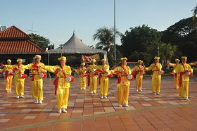 Les pratiquants ont organisé une pratique en groupe à 16 heures sur la place devant le Taman Tasik Titiwangsa. Avant la célébration, tous les pratiquants ont d'abord souhaité respectueusement à Maître Li Hongzhi un Joyeux Anniversaire.